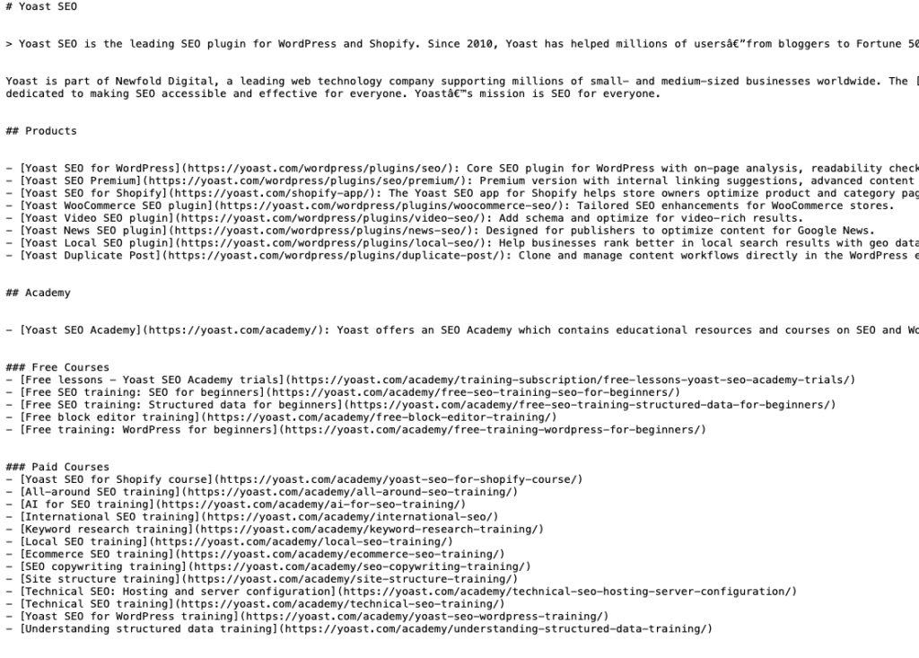 추가적인 내용 예시가 필요하시면 SEO 플러그인으로 유명한 yoast.com/llms.txt를 참고하시면 좋습니다.